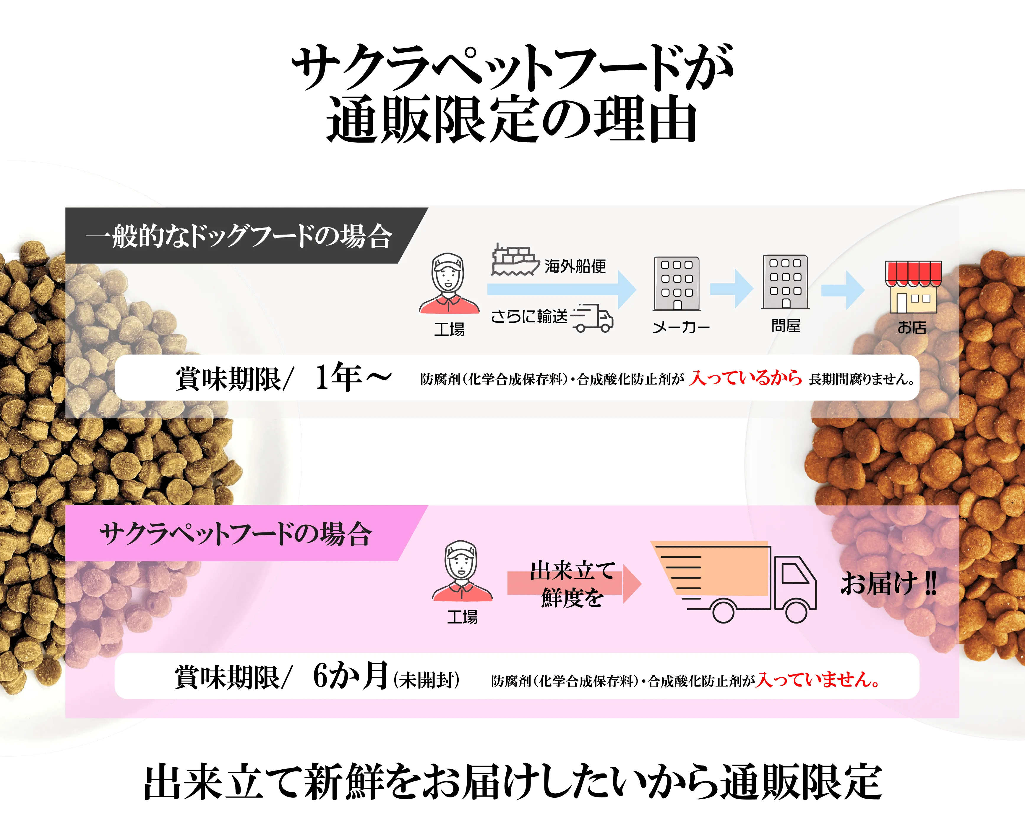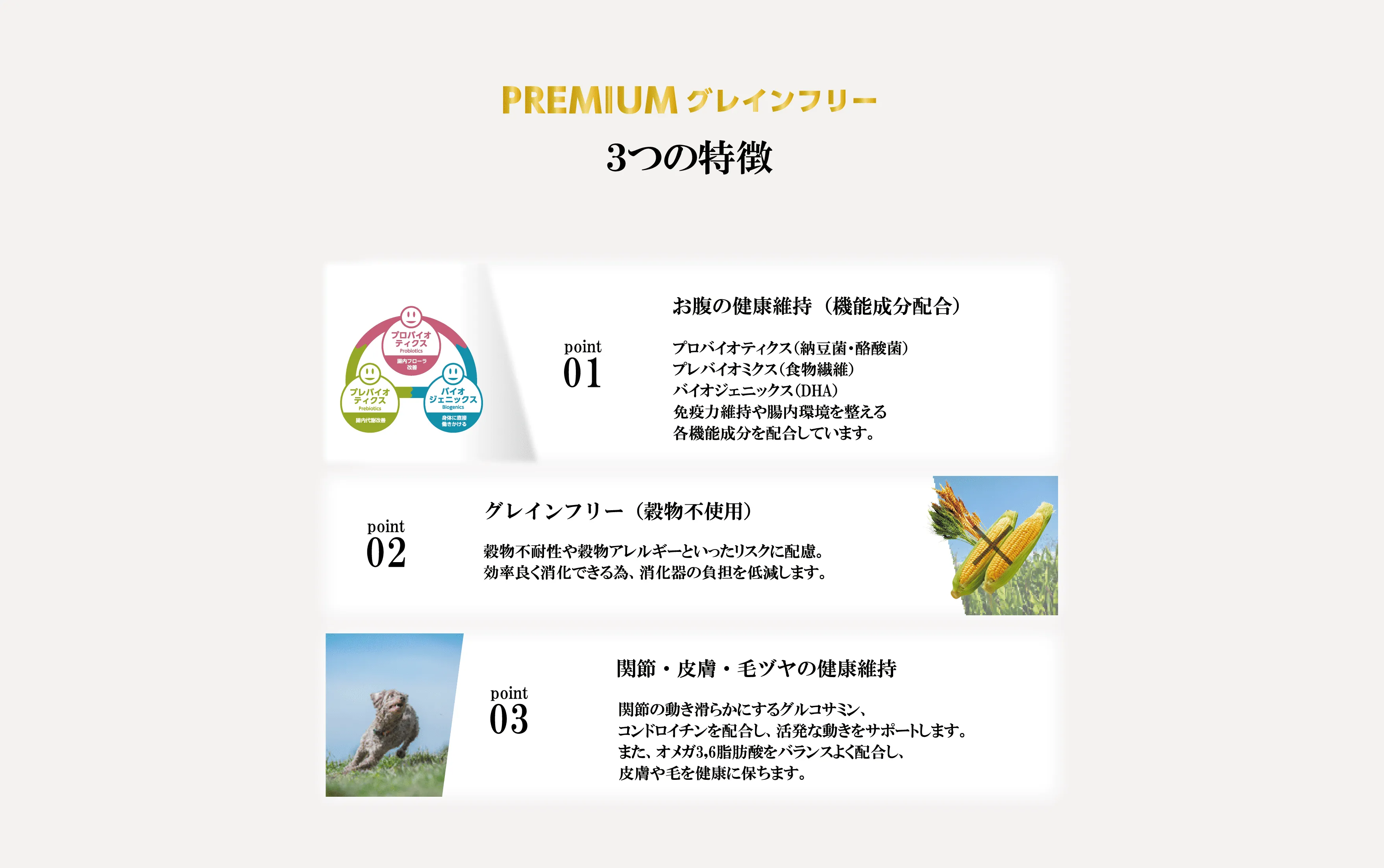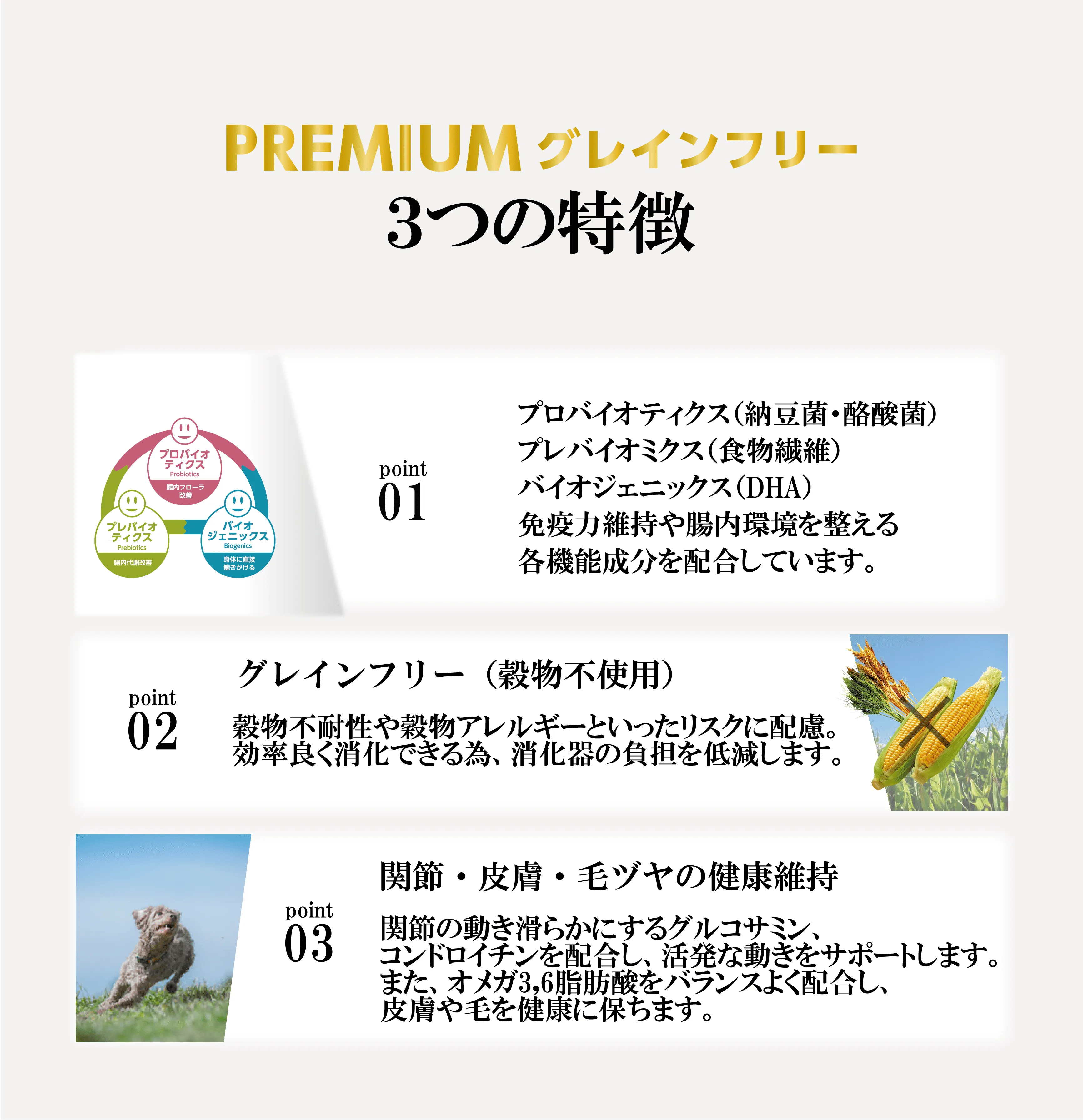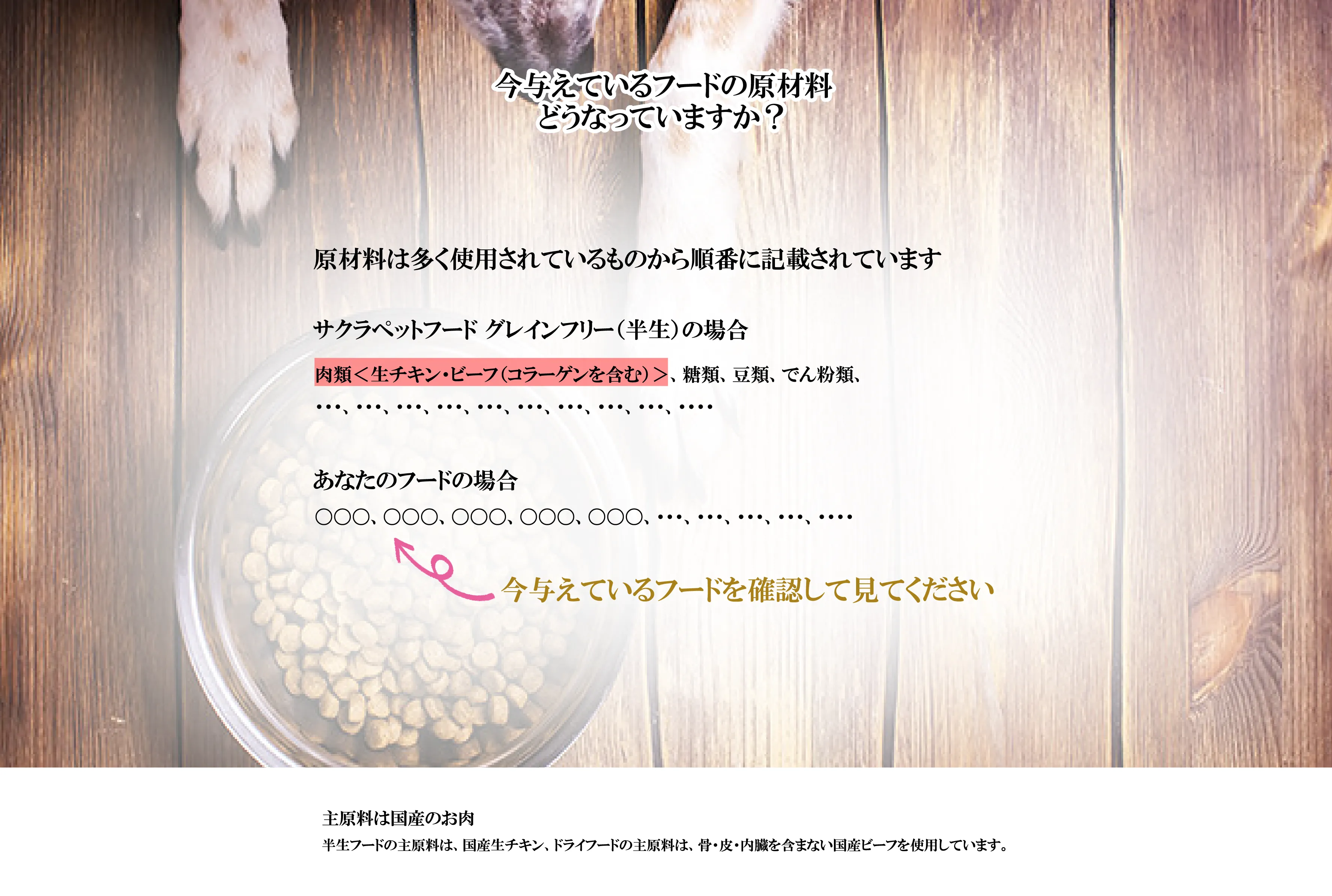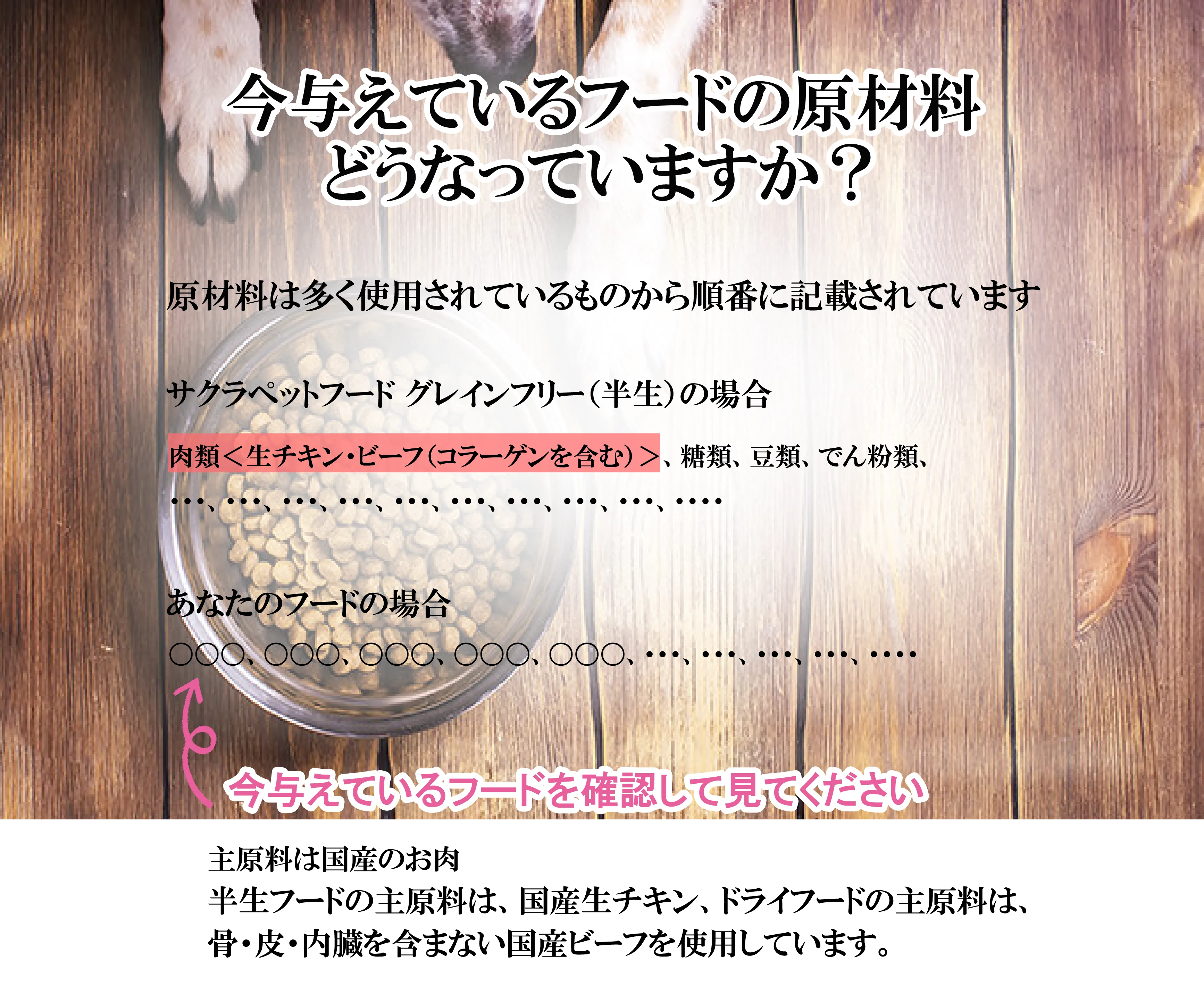 肉類(生チキン、ビーフ(コラーゲン含む))、糖類、野菜類(エンドウマメ、エンドウ蛋白)、 いも類(馬鈴薯でん粉)、魚介類(まぐろ)、油脂類(亜麻仁油、DHA含有精製魚油)、食物繊維、 グルコサミン(カニ由来)、きのこ類、サメ軟骨抽出物(コンドロイチンを含む)殺菌乳酸菌、 ミネラル類(P、Ca、Mg、Fe、Zn、Cu、Mn、I)、増粘安定剤(グリセリン、ガゼインナトリウム)、 酸味料(発酵乳酸)、ビタミン類(コリン、C、E、A、B12、ニコチン酸、パントテン酸、B6、B1、 B2、葉酸、D)、アミノ酸(DL-メチオニン、トリプトファン)、 酸化防止剤(ミックストコフェノール、ハーブ抽出物) |