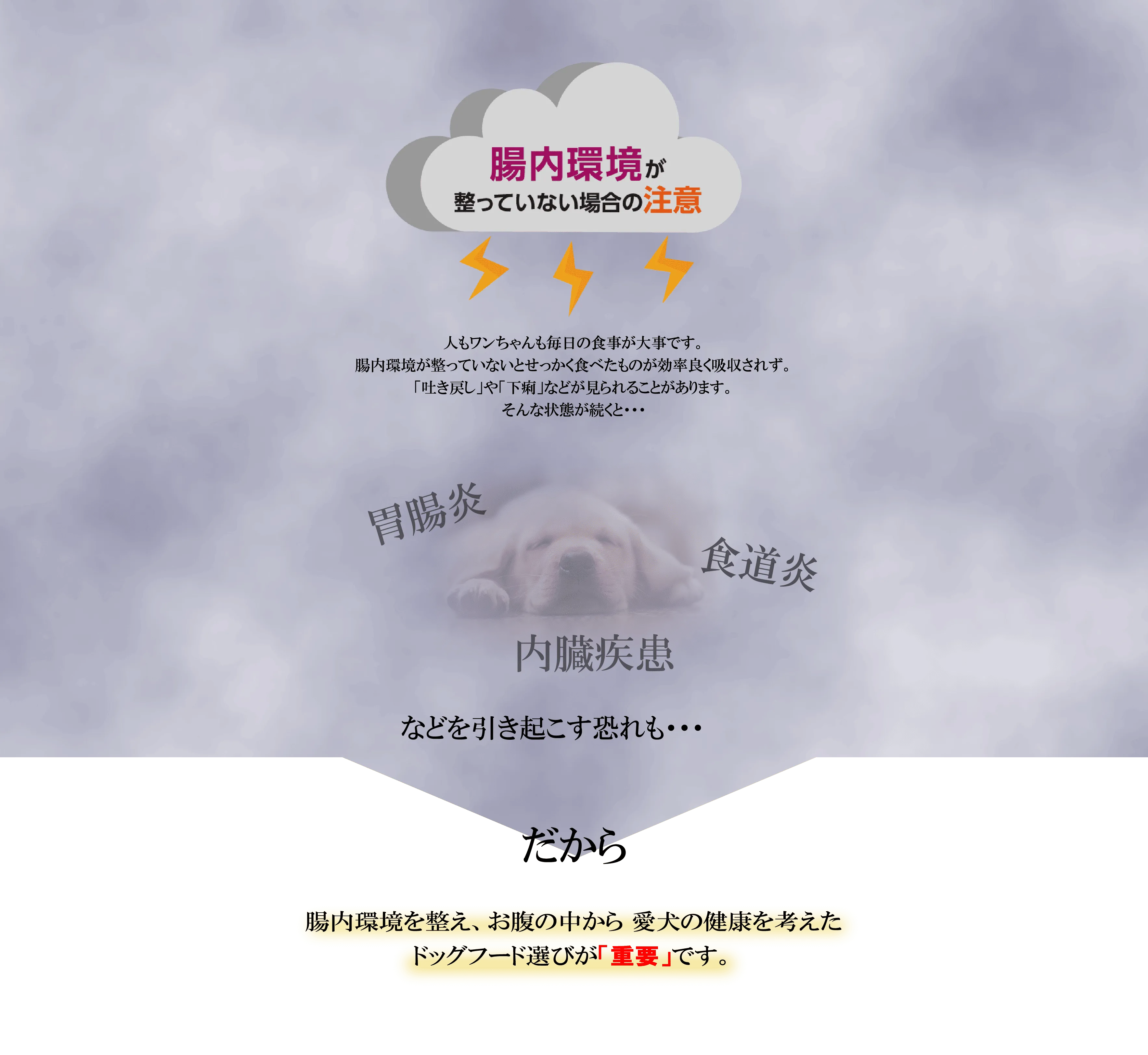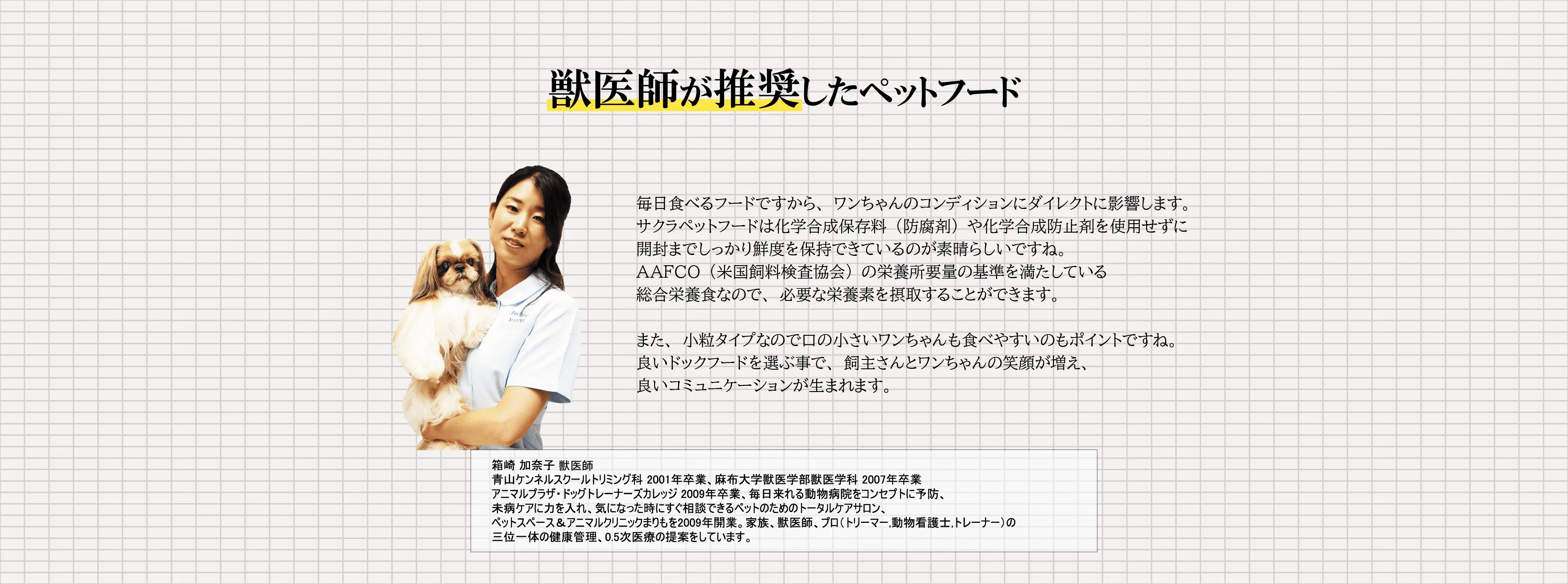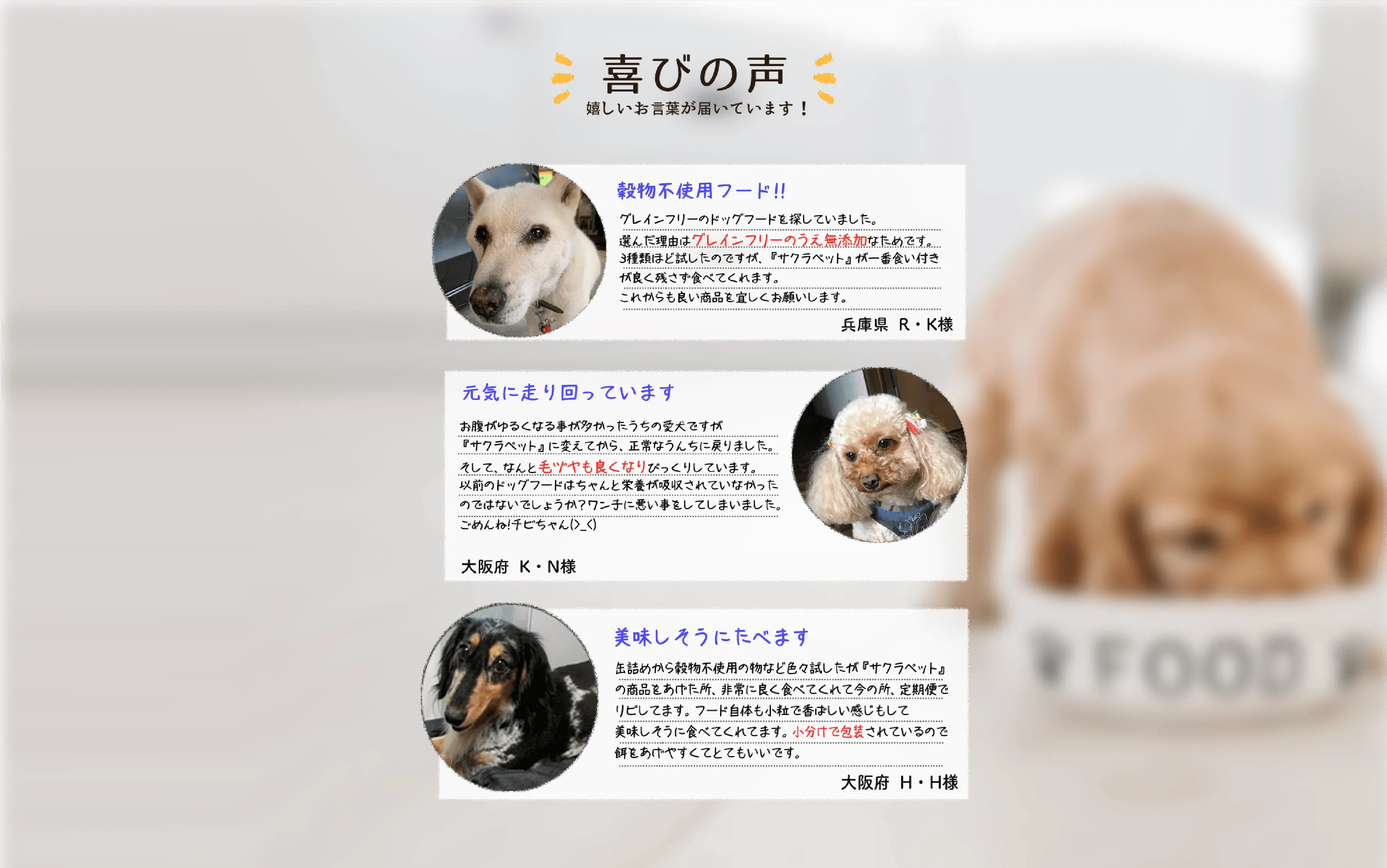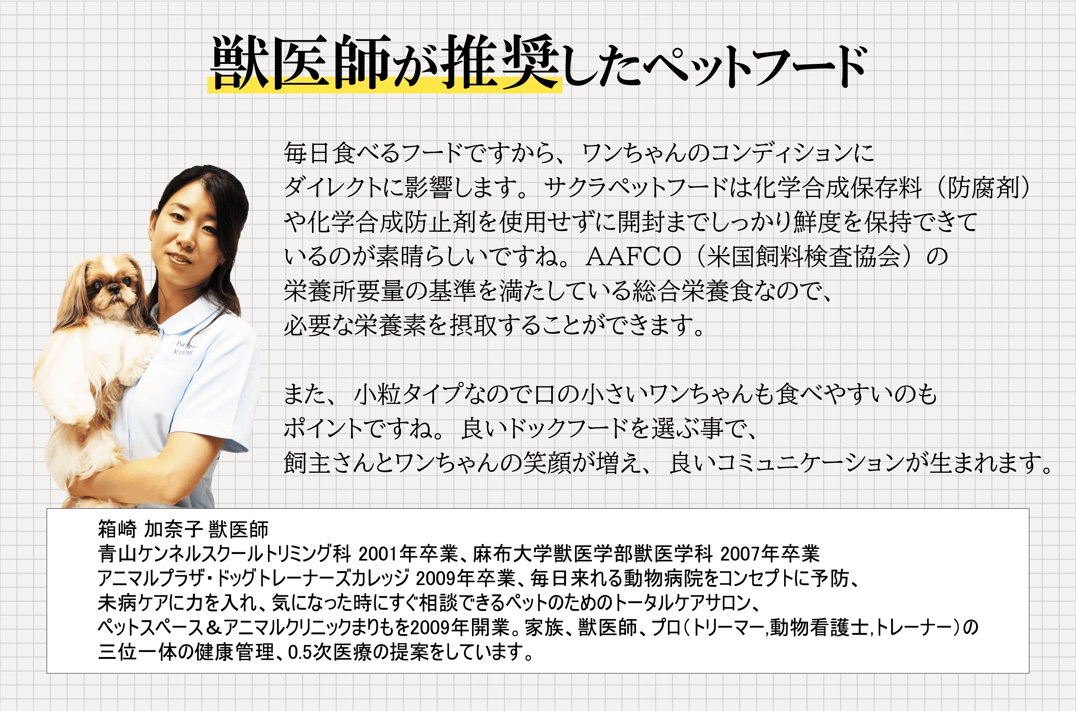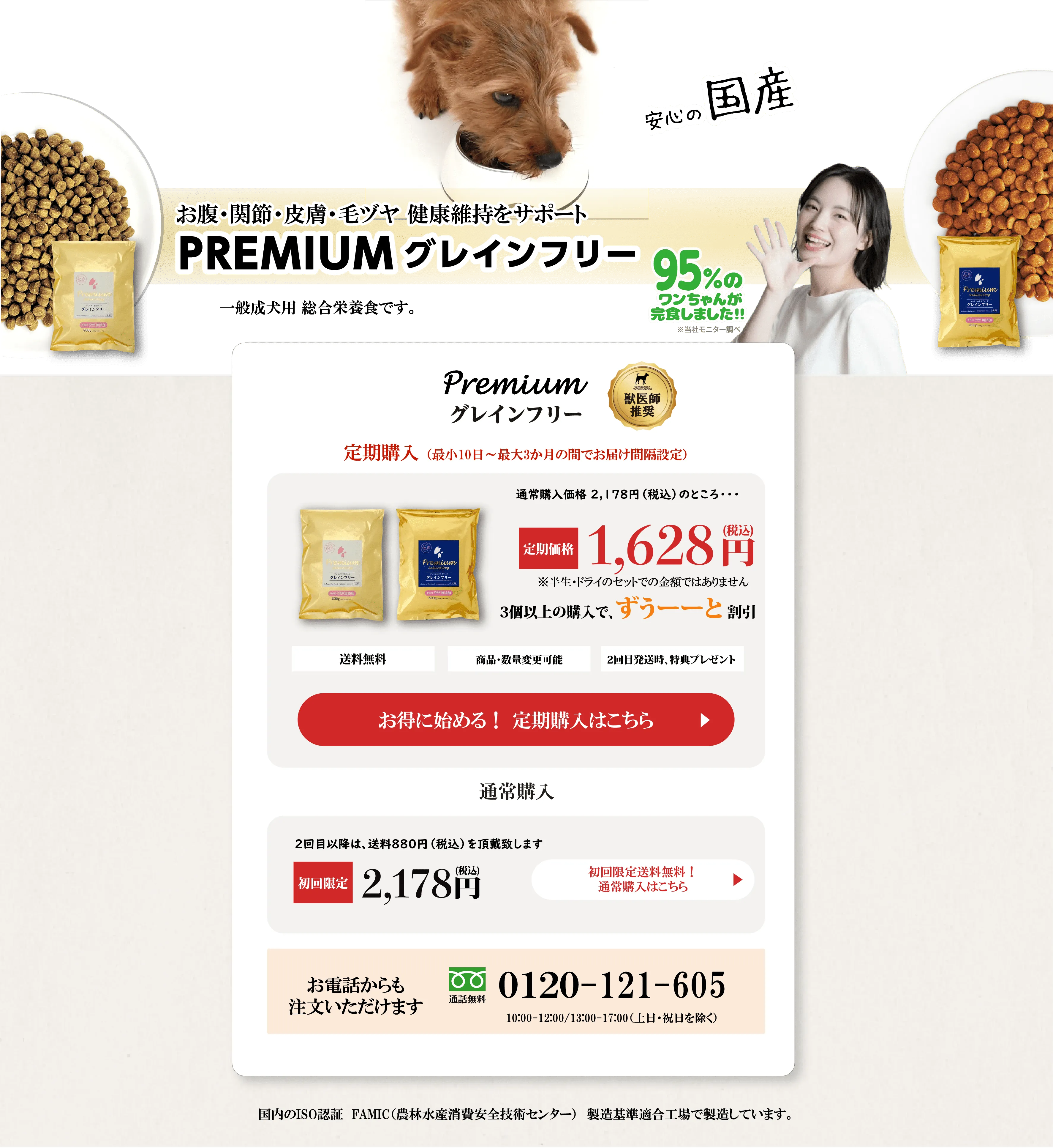 肉類(生チキン、ビーフ(コラーゲン含む))、糖類、野菜類(エンドウマメ、エンドウ蛋白)、 いも類(馬鈴薯でん粉)、魚介類(まぐろ)、油脂類(亜麻仁油、DHA含有精製魚油)、食物繊維、 グルコサミン(カニ由来)、きのこ類、サメ軟骨抽出物(コンドロイチンを含む)殺菌乳酸菌、 ミネラル類(P、Ca、Mg、Fe、Zn、Cu、Mn、I)、増粘安定剤(グリセリン、ガゼインナトリウム)、 酸味料(発酵乳酸)、ビタミン類(コリン、C、E、A、B12、ニコチン酸、パントテン酸、B6、B1、 B2、葉酸、D)、アミノ酸(DL-メチオニン、トリプトファン)、 酸化防止剤(ミックストコフェノール、ハーブ抽出物) |