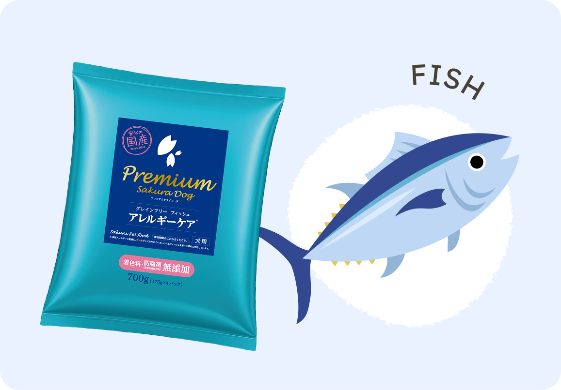 第一主原料に国産かつお・国産まぐろなどの魚を使用。消化しやすい良質なたんぱく質を主軸に栄養素を配合し、ワンちゃんが食べたくなるおいしさを追求しています。また、製造も国内工場で安全に加工しているので安心です。
