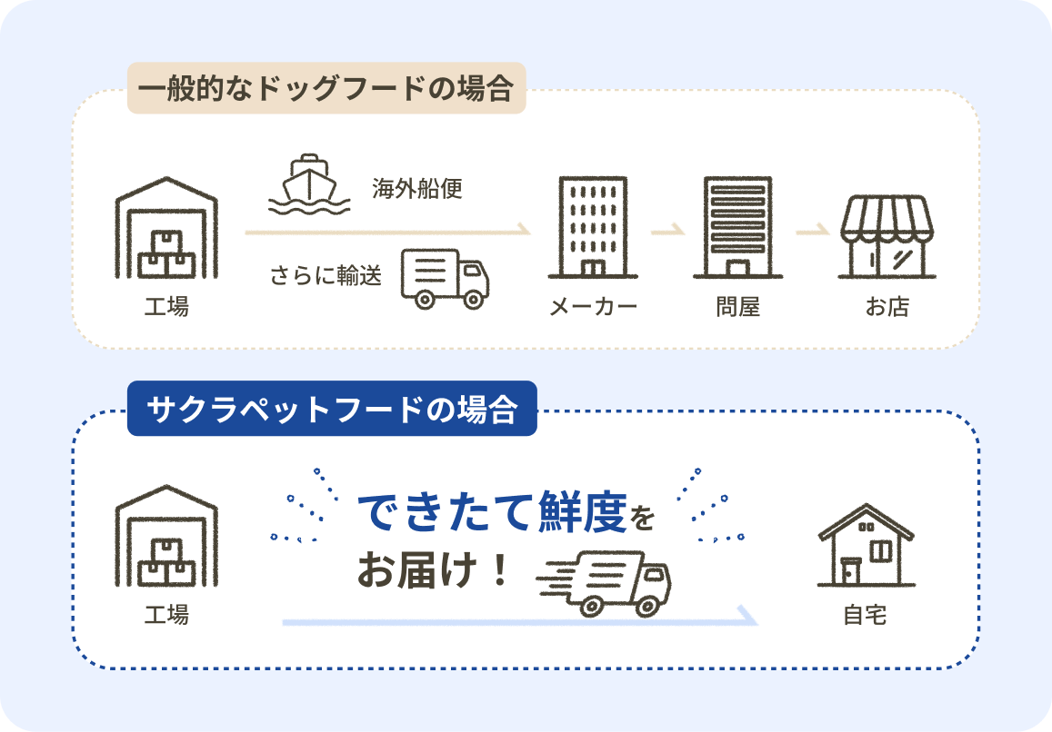 お店で買うフードの場合、工場から商品が手元に届くまで多くの工程をたどります。サクラペットフードは、商品の販売を通販に限定することで、できたてのような鮮度を手元にお届けいたします。