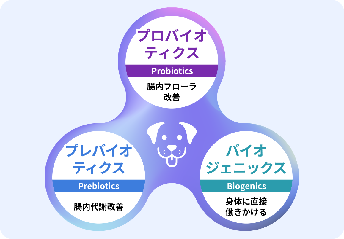 人の腸と同じように、ワンちゃんの体内にも腸内細菌が存在します。特に悪玉菌は、健康なワンちゃんであっても人より多いとされ、増えすぎることで体調に影響を及ぼすことがあります。そこで、腸内環境のバランスを整える3つの成分「プロバイオティクス・プレバイオティクス・バイオジェニックス」を配合。腸内に働きかけるだけでなく、からだ全体の健康を支える