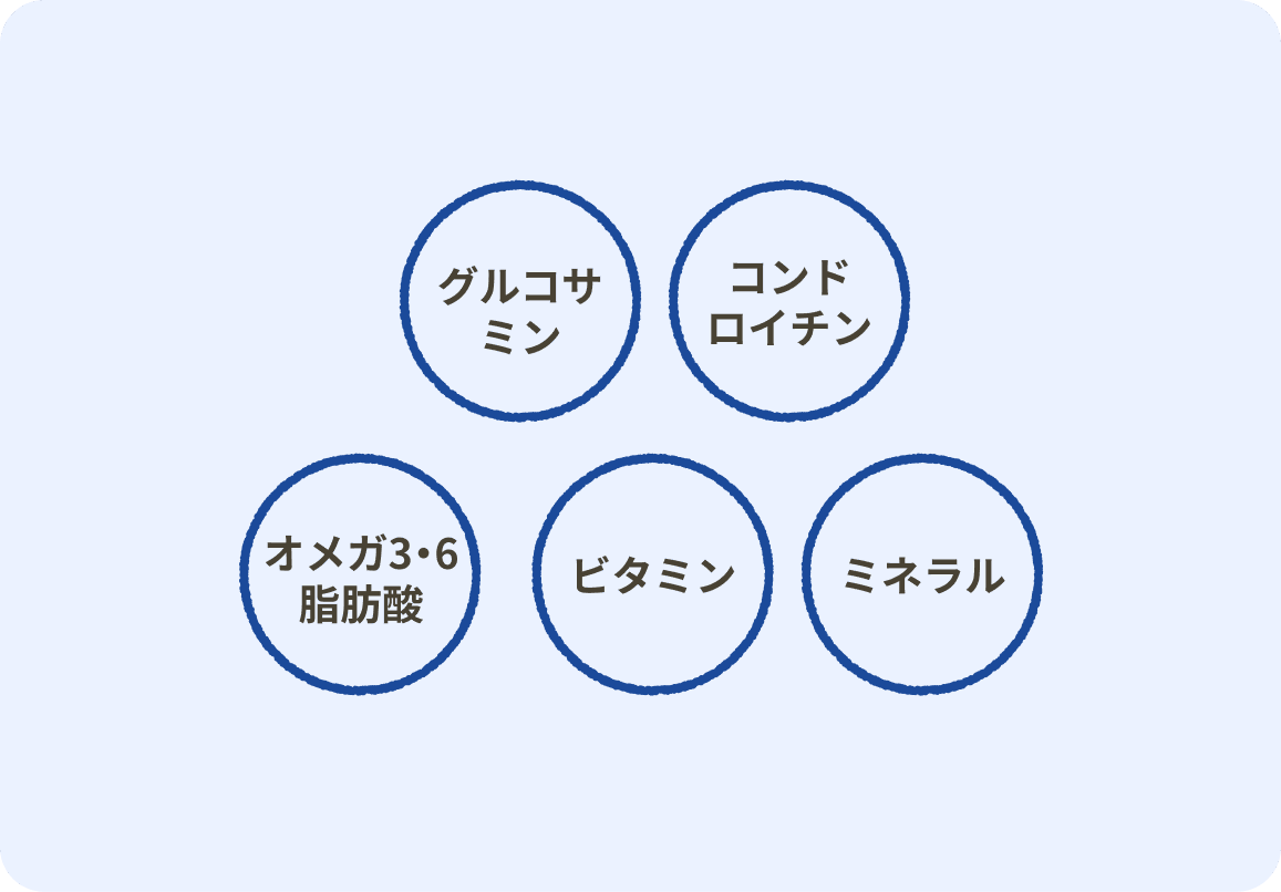 有効成分関節の動きをなめらかにするグルコサミンとコンドロイチンにより、ワンちゃんの活発な動きをサポートします。さらに、皮膚と被毛の健康を内側から支えるため、オメガ3・オメガ6脂肪酸、ビタミン、ミネラルをバランスよく取り入れ、乾燥やフケを抑え、毛並みのツヤやハリを保ちます。